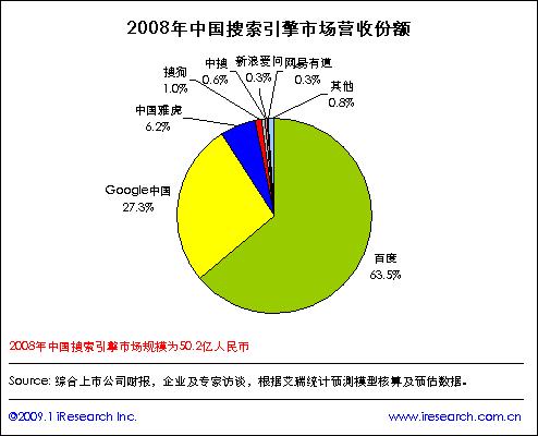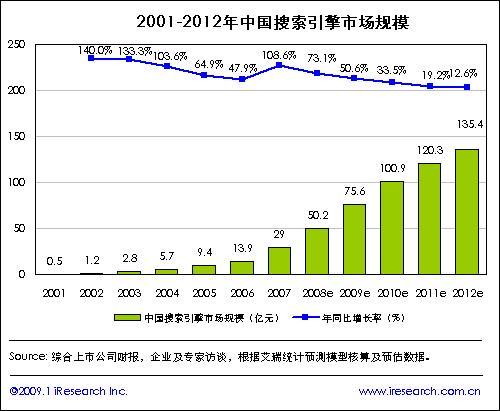 2008年搜索市場(chǎng)規(guī)模達(dá)50.2億元,年增長(zhǎng)73.1%,未來(lái)發(fā)展趨穩(wěn)定