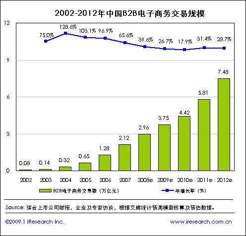 2008年中國(guó)B2B電子商務(wù)交易規(guī)模達(dá)2.96萬(wàn)億元,年增長(zhǎng)39.4%
