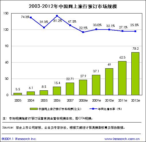 2008年網(wǎng)上旅行預(yù)訂市場(chǎng)規(guī)模為27.9億元,同比增長(zhǎng)22.9%