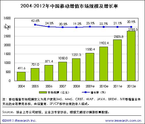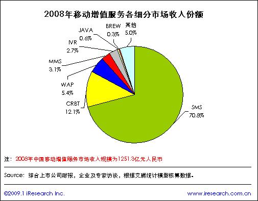 08年移動(dòng)增值服務(wù)市場(chǎng)規(guī)模達(dá)到1251.3億元,同比增長(zhǎng)19.2%